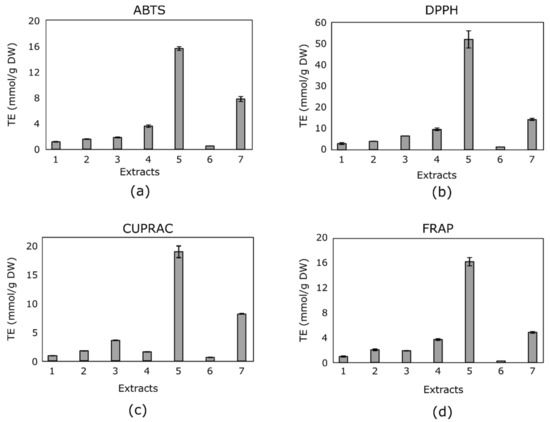 The antioxidant activity of all tested extracts by the (a) ABTS, (b) DPPH, (c) CUPRAC, and (d) FRAP methods.