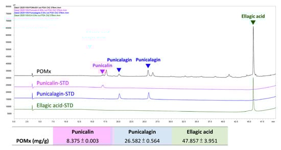 HPLC profile of POMx and the contents of its three main bioactive components. The HPLC profile for punicalagin, ellagic acid, and punicalin was provided as well as their contents within POMx (mg/g). STD means standard.