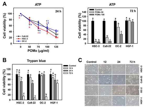 Cell viability and morphology of oral cancer cells after POMx incubation. Cells were incubated with 0, 50, and 100 μg/mL of POMx (control, POMx 50, and POMx 100) or other indicated concentrations for 24 or 72 h. (A) Cell viability for three oral cancer cell lines (HSC-3, Ca9-22, and OC-2) at 24 h and 72 h ATP assays. (B) Cell viability for three oral cancer cell lines (HSC-3, Ca9-22, and OC-2), and a normal oral cell line (HGF-1) at 0, 12, 24, and 72 h trypan blue assays. (C) Morphology for oral cancer cells and normal oral cells at 0, 12, 24, and 72 h for 100 μg/mL POMx incubation. Treatments without overlapping low cases (a to d) are significant differences for the same cell lines. p < 0.05. Data, mean ± SD (n = 3). The morphology image was photographed at 100× magnification.