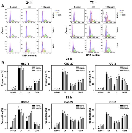 Cell cycle phase of oral cancer cells after POMx incubation. (A) Flow cytometry patterns. Cells (HSC-3, Ca9-22, and OC-2) were incubated with control, 50, and 100 μg/mL of POMx (control, POMx 50, and POMx 100) for 24 and 72 h. (B) Statistics for (A). Treatments without overlapping low cases (a to c) represent significant differences for the same cell lines. p < 0.05. Data, mean ± SD (n = 3).
