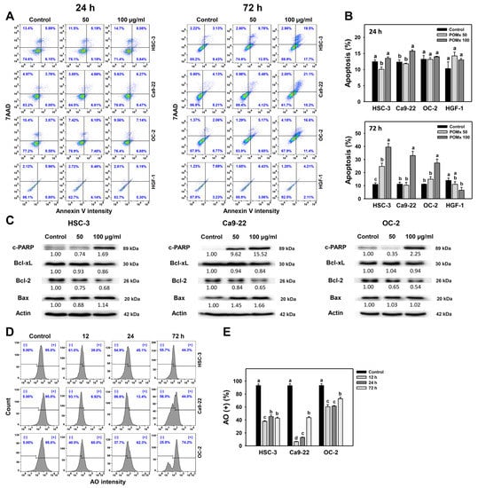 Apoptosis and autophagy changes of oral cancer cells after POMx incubation. Cells (HSC-3, Ca9-22, and OC-2) were incubated with control, 50, and 100 μg/mL of POMx (control, POMx 50, and POMx 100) for 24 and 72 h. (A) Annexin V/7AAD flow cytometry patterns. (B) Statistics for (A). (C) Western blotting for apoptosis marker expressions after 72 h POMx (0, 50, and 100 μg/mL) incubation. (D) Acridine orange (AO) flow cytometry patterns at 0, 12, 24, and 72 h for 100 μg/mL POMx incubation (E) Statistics for (D). Treatments without overlapping low cases (a to d) are significant differences for the same cell type. p < 0.001. Data, mean ± SD (n = 3).