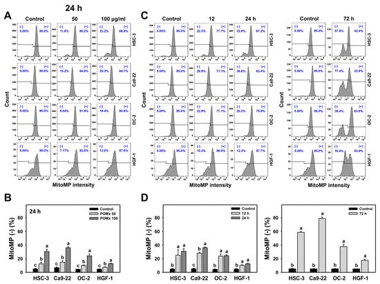 After time course treatments of POMx, the dynamics of flow cytometry patterns for MitoMP in these oral cancer cells are shown (Figure 5C). The MitoMP (−) (%) of these three oral cancer cells is increased over time (12, 24, and 72 h) after POMx incubation compared with the control (Figure 5D). Moreover, POMx induces more MitoMP (−) (%) in three oral cancer cells than in normal oral cells throughout the time course. Accordingly, POMx causes higher MitoMP destruction in oral cancer cells than in normal oral cells.