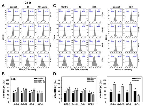 After POMx incubations (0, 50, and 100 μg/mL) for 24 h, the patterns for MitoSOX in oral cancer (Ca9-22, HSC-3, and OC-2) and normal oral (HGF-1) cells are shown (Figure 6A). The MitoSOX (+) (%) of these three oral cancer cells were dose-responsively increased after POMx incubation while remaining unchanged in normal cells (Figure 6B).
