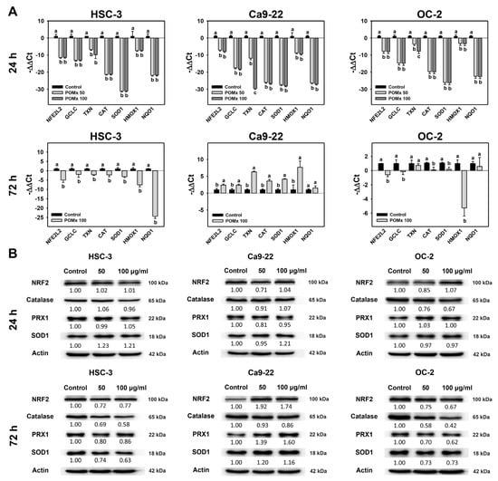 Inhibition of antioxidant pathways may induce increased oxidative stress []. Accordingly, the antioxidant signaling gene expression for mRNA [], including NFE2L2, GCLC, TXN, CAT, SOD1, HMOX1, and NQO1, was examined for POMx-incubated oral cancer cells. After 24 h POMx incubations (0, 50, and 100 μg/mL), the relative mRNA gene expressions of these antioxidant genes in oral cancer (Ca9-22, HSC-3, and OC-2) cells were downregulated compared with the control (Figure 7A, top). However, for 24 h POMx incubations, the protein expressions of these antioxidant genes in oral cancer (Ca9-22, HSC-3, and OC-2) cells were almost unchanged (Figure 7B, top). Accordingly, mRNA and protein expressions were regulated differentially at 24 h POMx incubation.