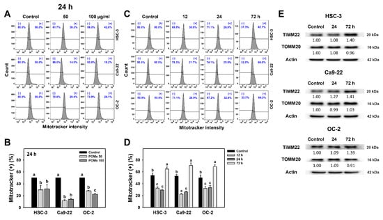 After time course treatments of POMx, the mitochondrial resident protein (TIMM22 and TOMM20) expressions were detected in oral cancer cells (Figure 8E). For 24 h POMx incubations, the TIMM22 and TOMM20 are almost unchanged in oral cancer cells. However, although TOMM20 remains unchanged, TIMM22 is upregulated at 72 h POMx incubations, consistent with Mitotracker detection. Accordingly, Mitotracker detections and protein expressions are differentially regulated at 24 h POMx incubation but in a consistently regulated manner at 72 h.