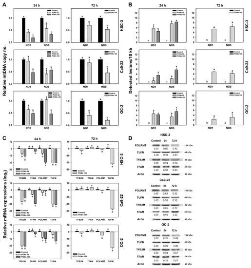 mtDNA copy number, mtDNA lesion, and mitochondrial biogenesis of oral cancer cells after POMx incubation. Cells (HSC-3, Ca9-22, and OC-2) were incubated with 0, 50, and 100 μg/mL of POMx (control, POMx 50, and POMx 100) for 24 and 72 h. (A) Relative mtDNA copy number in ND1 and ND5 genes. (B) mtDNA lesion frequency per 10 kb DNA between ND1 to ND5 genes. (C) Relative mRNA expressions (log2) for mitochondrial biogenesis genes. Treatments without overlapping low cases (a to c) are significantly different for the same cell lines. p < 0.05. Data, mean ± SD (n = 3). (D) Western blotting for mitochondrial biogenesis genes at 24 and 72 h POMx incubations. Cells were incubated with control and 100 μg/mL of POMx for 24 and 72 h.