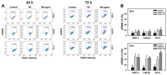 γH2AX change of oral cancer cells after POMx incubation. (A) Dose-response to γH2AX flow cytometry patterns. Cells (HSC-3, Ca9-22, and OC-2) were incubated with control, 50, and 100 μg/mL of POMx (control, POMx 50, and POMx 100) for 0, 24, and 72 h. The γH2AX (+) population (%) is marked within a dashed line. (B) Statistics of γH2AX (+) (%) in (A). Treatments without overlapping low cases (a to c) are significantly different for the same cell lines. p < 0.001. Data, mean ± SD (n = 3).