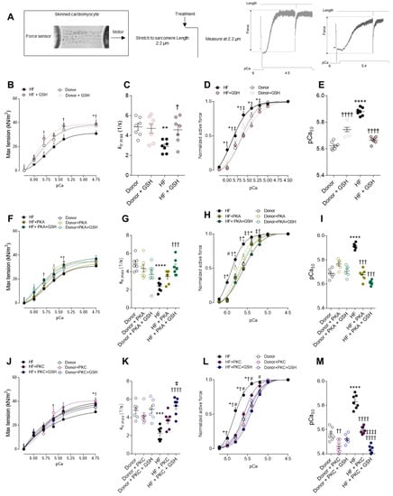 Cardiomyocyte max tension and calcium sensitivity. (A) Representative image of skinned cardiomyocytes and stretch protocol. (B) Maximum tension of donors and HF cardiomyocytes before and after reduced glutathione (GSH) treatment at different calcium concentrations. (C) Bars indicate ktr at saturating [Ca2+] (at pCa 4.5; ktr, max) before and after GSH treatment. (D) Calcium sensitivity of donors and HF cardiomyocytes with and without GSH treatment at different calcium concentrations. (E) pCa value for the half-maximal Ca2+-induced contraction before and after GSH. (F) Maximum tension of donors and HF cardiomyocytes with and without protein kinase A (PKA) treatment, and after incubations with both PKA and GSH at different calcium concentrations. (G) Bars indicate ktr at saturating [Ca2+] (at pCa 4.5; ktr, max) before and after PKA treatment. (H) Calcium sensitivity of donors and HF cardiomyocytes before and after PKA treatment at different calcium concentrations. (I) pCa value for the half-maximal Ca2+-induced contraction before and after GSH. (J) Maximum tension of donors and HF cardiomyocytes with and without protein kinase C (PKC) treatment and after incubations with both PKC and GSH at different calcium concentrations. (K) Bars indicate ktr at saturating [Ca2+] (at pCa 4.5; ktr, max) before and after PKC treatment. (L) Calcium sensitivity of donors and HF cardiomyocytes before and after PKC treatment at different calcium concentrations. (M) pCa value for the half-maximal Ca2+-induced contraction before and after GSH. Data are shown as mean ± SEM, (n = 16–20/4 cardiomyocytes/heart). * p < 0.05/** p < 0.01/*** p < 0.001/**** p < 0.0001 donor vs. HF, † p < 0.05/†† p < 0.01/††† p < 0.001/†††† p < 0.0001 HF before vs. after GSH or PKA, ‡ p < 0.05 HF before vs. after GSH + PKA or +PKC, and # p < 0.05 donor before vs. after PKA by one-way ANOVA. P-values were corrected for multiple comparisons by the Tukey method.