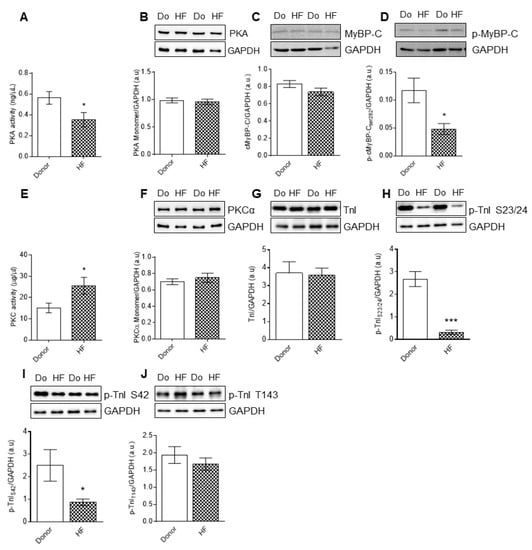 PKA and PKC activities, and cMyBP-C and cTnI phosphorylation of myocardial biopsies of human HF patients. (A) Protein kinase A (PKA) activity. (B) PKA monomer levels. (C) Cardiac myosin binding protein-C (cMyBP-C) levels. (D) Total cMyBP-C phosphorylation. (E) Protein kinase C (PKC) activity. (F) PKCα monomer levels. (G) Cardiac troponin I (cTnI) levels. (H) Phospho(P)-site-specific within cTnI at Ser23/24. (I) P-site-specific within cTnI at Ser42. (J) P-site-specific within cTnI at Thr 143. Data are shown as mean ± SEM. * p < 0.05/*** p < 0.001 donor vs. HF by Student t-test (n = 8–10, hearts per group).