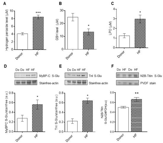 Myocardial oxidative stress parameters, and S-glutathionylation of cTnI and cMyBPC. (A) Hydrogen peroxide (H2O2) concentration levels. (B) Reduced glutathione (GSH) concentration levels. (C) Lipid peroxide (LPO) concentration levels. (D) S-glutathionylation of cMyBPC. (E) S-glutathionylation of cTnI. (F) S-glutathionylation of N2B-titin. Data are shown as mean ± SEM. * p < 0.05/** p < 0.01/*** p < 0.001 donor vs. HF by Student t-test (n = 8–10, hearts per group).