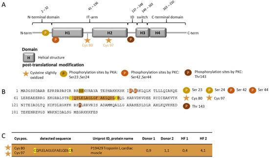 One heavily oxidized cysteine residue in the HF patient, cMyBP-C at position 443, and two slightly oxidized cysteine residues at 623 and 1124, were identified (UniProtKB- Q14896.4 (MYPC3_HUMAN) (Figure 4). Other cysteine residues, at positions 475, 566 and 651 in the sequence, were unregulated in the HF patients. The heavily oxidized Cys 443 is located at the Ig-like C2-type domain of cMyBP-C, and the two slightly oxidized residues in regions C4 and C9 (Figure 4). For cTnI, we could identify two slightly oxidized cysteines at positions 80 and 97 in one HF patient. Both the cysteine residues are located at the IT arm of cTnI (Figure 5). The IT arm is less mobile, and is responsible for the anchoring of the C-terminal domain of troponin C [34].