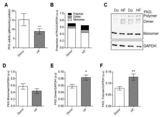 As previously demonstrated by multiple studies, PKG-dependent hypo-phosphorylation of titin contributes to the increased stiffness that is observed in heart failure [23,35]. In our study, and due to increased oxidative stress, PKG activity was significantly decreased in HF compared to the donors (Figure 6A). Using Western blot analysis, PKG showed mono, dimer, and polymer formation (Figure 6B,C), suggesting PKG oxidation in end-stage human failing hearts, as shown by the increased levels of dimeric and polymeric formation (Figure 6D–F).