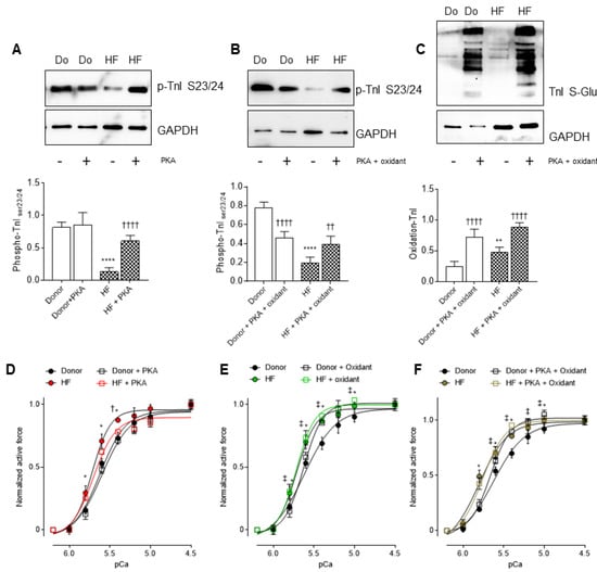 To better understand the changes in the PKA-dependent phosphorylation of myofilament proteins, we investigated whether cTnI hypo-phosphorylation was attributable to the oxidative stress that was observed in the HF patients. Upon PKA treatment, site-specific phosphorylation of cTnI S23/S24 was increased in the HF tissues. However, PKA administration, followed by an oxidant reagent, resulted in a decrease in cTnI S23/S24 phosphorylation in both the donor and HF tissues, to lower levels compared to the non-treated tissues. The latter was accompanied by high cTnI oxidation levels, indicating that protein oxidation mediates the dysregulated phosphorylation in both HF and donor hearts, suggesting altered PKA affinity and/or the accessibility to phospho-sites neighboring the oxidized cysteines.