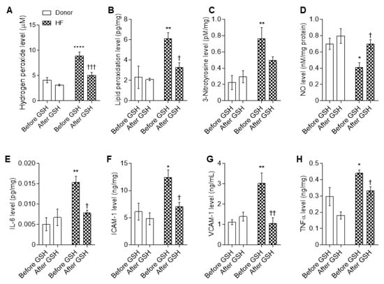 Oxidative stress markers, including hydrogen peroxide (H2O2), lipid peroxide (LPO), and 3-nitrotyrosine, were significantly elevated in human LV myocardial tissue compared to the donors (Figure 8A–C). We also detected high levels of pro-inflammatory cytokines, including interleukin-6 (IL-6), intercellular cell adhesion molecule-1 (ICAM-1), vascular cell adhesion molecule-1 (VCAM-1), and tumor necrosis factor alpha (TNFα), in the HF tissues compared to the donors (Figure 8E–H). Treatment with GSH decreased the elevated oxidative stress markers and pro-inflammatory cytokines to donor levels, whereas no effects were detected in the controls after GSH treatment (Figure 8A–C,E–H). Furthermore, we found nitric oxide (NO) bioavailability in HF patients to be significantly decreased compared to the donors (Figure 8D). GSH supplementation significantly increased the NO levels of the HF myocytes to donor levels, whereas (NO) levels were unchanged in the donor group upon GSH treatment (Figure 8D); this indicates oxidative stress-mediated attenuation of (NO) bioavailability in HF patients.