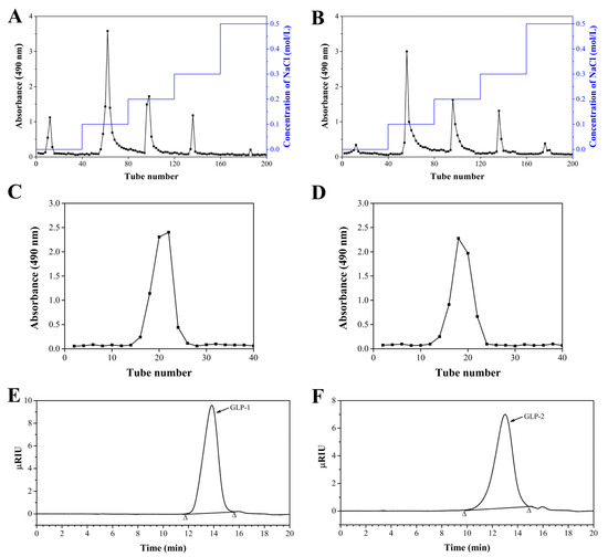 Stepwise elution profiles of CGLP-1 (A) and CGLP-2 (B) on DEAE-Sepharose fast-flow column. Elution profiles of the 0.1 M NaCl fraction obtained from CGLP-1 (C) and CGLP-2 (D) on Sephacryl S-300 HR column. HPGPC graphs of GLP-1 (E) and GLP-2 (F).