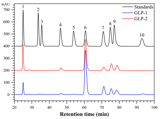 Monosaccharide compositions of GLP-1 and GLP-2 analyzed by HPLC (1—mannose, 2—ribose, 3—rhamnose, 4—glucuronic acid, 5—galacturonic acid, 6—glucose, 7—galactose, 8—xylose, 9—arabinose, and 10—fucose).