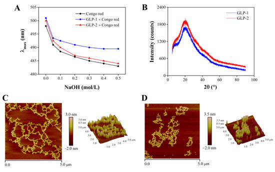 Maximum absorption wavelength of Congo red–polysaccharide complex and Congo red at different NaOH concentrations (A). XRD analysis results of GLP-1 and GLP-2 (B). AFM planar and cubic images of GLP-1 (scan size: 5 μm) (C). AFM planar and cubic images of GLP-2 (scan size: 5 μm) (D).
