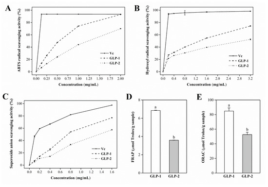 As shown in Figure 4, both GLP-1 and GLP-2 exhibited obvious ABTS, hydroxyl radical, and superoxide anion radical scavenging activities in a concentration-dependent manner. Moreover, the IC50 values of GLP-1 for ABTS, hydroxyl radical, and superoxide anion radical were 0.56 mg/mL, 1.32 mg/mL, and 0.76 mg/mL, respectively, which were lower than those of GLP-2 (1.18 mg/mL, 2.78 mg/mL, and 1.34 mg/mL). However, the radical scavenging abilities of Vc were relatively higher than those of GLP-1 and GLP-2. For FRAP and ORAC assays (Figure 4D,E), the TEAC values of GLP-1 were 6.85 µmol/g and 84.8 µmol/g, respectively, which were 2.77 and 1.61 times larger than those of GLP-2 (3.59 µmol/g and 52.6 µmol/g, respectively). The TEAC values of GLP-1 and GLP-2 from the FRAP assay were lower than those from the ORAC assay. On one hand, this was due to the different reaction mechanisms of these two methods. On the other hand, both GLP-1 and GLP-2 exhibited weak reducing power, which was consistent with the results from a previous study [51]. The results of five antioxidant methods consistently indicated that GLP-1 had better antioxidant activity than GLP-2.