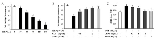 The viability of NIH3T3 cells treated with various tBHP concentrations (A). The viability (B) and LDH leakage (C) of NIH3T3 cells treated with different GLP-1 concentrations or Trolox and co-cultured with 100 µM of tBHP. Data are presented as mean ± S.D. Values with different letters (a–f) denote the significant differences (p < 0.05).