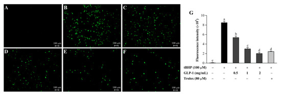 Effect of GLP-1 on intracellular ROS level: blank control group (A); cells treated with 100 μM tBHP (B); 100 μM tBHP + 0.5 mg/mL GLP-1 (C); 100 μM tBHP + 1 mg/mL GLP-1 (D); 100 μM tBHP + 2 mg/mL GLP-1 (E); 100 μM tBHP + 80 μM Trolox (F). Fluorescence intensity analysis (G). Data are presented as mean ± S.D. Values with different letters (a–d) denote the significant differences (p < 0.05).