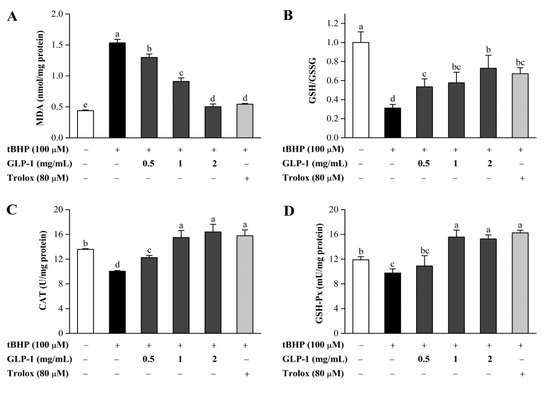The antioxidant enzyme system plays an important role in the protection against oxidative stress. Catalase and GSH-Px are included in this system, and their activities have been widely used as important antioxidant biomarkers [7,60]. Catalase converts H2O2 to H2O, and GSH-Px participates in catalyzing the reaction of hydroperoxides, which requires GSH as the electron donor. Therefore, their activities are crucial for maintaining the steady-state concentration of H2O2 and the control level of lipid hydroperoxides [61,62]. As shown in Figure 7C,D, compared with the blank control, NIH3T3 cells exposed to tBHP featured a significant decrease in CAT and GSH-Px activities. Nevertheless, GLP-1 treatment significantly elevated CAT and GSH-Px activities in comparison to the tBHP-treated group. Additionally, GLP-1 at higher concentrations (1 mg/mL and 2 mg/mL) markedly enhanced CAT and GSH-Px activities compared with those of the untreated cells. These findings indicated that GLP-1 might protect NIH3T3 cells against oxidative damage through the enzymatic mechanism.