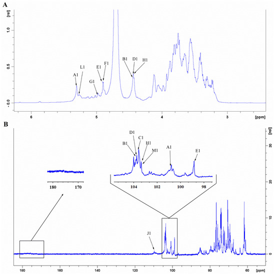 The linkage sequence and sites of glucosyl moieties were determined by the HMBC spectrum (Figure 11). Residue C C-1 was related to residue B H-4 and C H-3, and residue B C-4 was related to residue B H-1. Hence, the following connectivity was established: →3)-β-D-Glcp-(1→3)-β-D-Glcp-(1→4)-β-D-Glcp-(1→4)-β-D-Glcp-(1→. Inter-residual correlations were observed between residue H C-1 and G H-6, and D C-1 and H H-6. Thus, the sequence for residues D, G, and H was established as follows: →6)-β-D-Galp-(1→4,6)-β-D-Galp-(1→2,6)-β-D-Galp-(1→. In addition, residue D C-6 was related to residue B H-1, and residue G C-1 was related to residue C H-3. Based on the above results, the backbone of GLP-1 was confirmed by the linkages of residues B, C, D, G, and H.