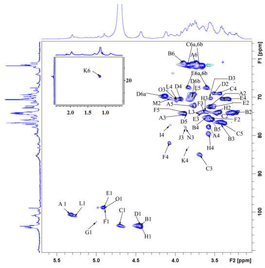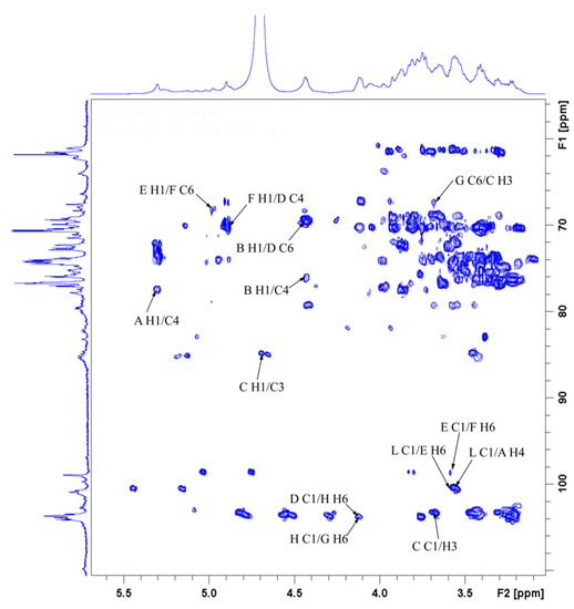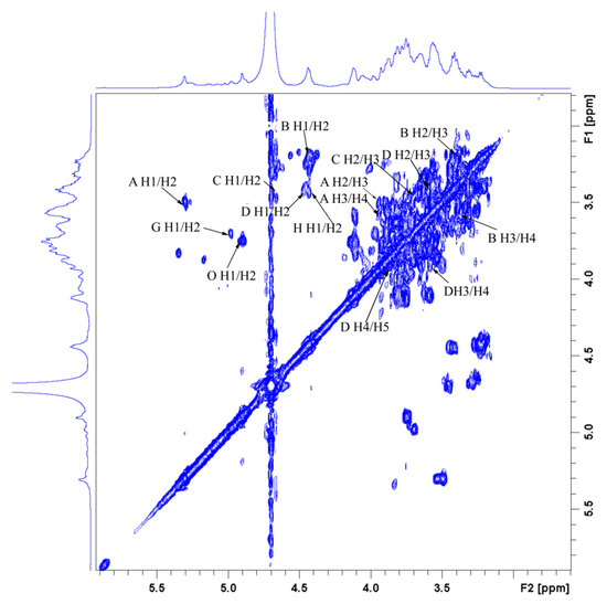 The assignations of residue signals in 1H and 13C NMR spectra were further analyzed by the 1H-1H COSY and HSQC spectra. The residue A, namely →4)-α-D-Glcp-(1→, was taken as an example in this section. The cross-peaks 5.32/3.55 and 3.55/3.88 ppm were detected in the 1H-1H COSY spectrum (Figure 9). Given that the signal at 5.32 ppm corresponded to the H-1 of residue A, 3.55 and 3.88 ppm were attributed to the H-2 and H-3 of residue A, respectively. Similarly, the signals at 3.58, 3.76, and 3.77 ppm were assigned to the H-4, H-5, and H-6 of residue A. From the HSQC spectrum (Figure 10), the strong cross-peak H/C (5.32/100.66 ppm) revealed close connectivity between H-1 and C-1. The carbon peaks of C-2 (72.53 ppm), C-3 (74.25 ppm), C-4 (77.69 ppm), C-5 (72.22 ppm), and C-6 (61.43 ppm) were also found in the HSQC spectrum. Based on the above-mentioned analogy and the literature data, the C/H chemical shifts of all residues were confirmed and are presented in Table 3 [24,34,64,65,66,67].