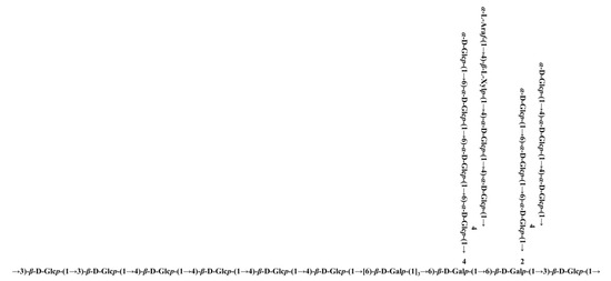 Moreover, contacts were observed between residue L C-1 and A H-4, and A C-4 and A H-1, suggesting the presence of α-D-Glcp-(1→4)-α-D-Glcp-(1→4)-α-D-Glcp-(1→. Additionally, residue I C-4 correlated with residue J H-1, and residue A C-4 correlated with residue I H-1, which proved the existence of α-L-Araf-(1→4)-β-L-Xylp-(1→4)-α-D-Glcp-(1→. Inter-residual correlations were also found between residue L C-1 and E H-6, and residue F C-6 and E H-1. Hence, the following sequences were obtained: α-D-Glcp-(1→6)-α-D-Glcp-(1→4,6)-α-D-Glcp-(1→. Again, residue D C-4 had inter-residual contacts from residue F H-1, indicating the presence of →4,6)-α-D-Glcp-(1→4,6)-β-D-Galp-(1→. Based on the monosaccharide composition analysis, methylation analysis, and NMR spectroscopy, the probable preliminary structure of GLP-1 is shown in Figure 12.