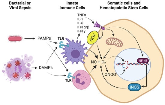 Immune cell activation during the hyper-inflammatory phase of sepsis, secretion and amplification of cytokines, and up-regulation of RONS production by immune, somatic, and hematopoietic stem cells: Pathogen-associated molecular patterns (PAMPs) and danger-associated molecular patterns (DAMPs) generated by bacterial or viral sepsis activate pattern recognition receptors (PRRs) such as toll-like receptors (TLRs) of innate immune cells such as macrophages and neutrophils (shown), leading to ROS and RNS production as part of the pathogen killing response; however, these cells also adhere to vascular and parenchymal cells causing oxidant injury []. In addition, there is upregulation and secretion of pro-inflammatory cytokines (cytokine storm) such as tumor necrosis factor α (TNFα), interleukin-1 (IL-1), interleukin-6 (IL-6), interferon α/β (IFNα/β), and interferon γ (IFNγ) from activated macrophages. Proinflammatory signaling leads to upregulation of NADPH oxidase (NOX), which produces reactive oxygen species (ROS) such as superoxide (O2−), and upregulation of inducible nitric oxide synthase (iNOS), which produces nitric oxide (NO), in immune, somatic, and hematopoietic stem cells. NO and O2− can combine to produce peroxynitrite (ONOO−). Elevated levels of these reactive oxygen and nitrogen species (RONS) lead to DNA damage and upregulation of the DNA damage response (DDR). Additional ROS such as H2O2, hydroxyl radical and hypochlorous acid also contribute to DNA damage but are not shown for clarity of presentation.