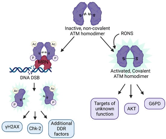 Interestingly, the DNA damage and direct oxidation signaling pathways of ATM are known to function independently of one another []. Inactivation of covalent disulfide bridging of the monomers does not disturb MRN activation of the enzyme [,,]. In another study, ATM autophosphorylation and activation was found to occur upon treatment with low levels of hydrogen peroxide that did not result in DNA damage (as indicated by γH2AX staining) in primary and transformed human cells []. Additionally, covalently linked ATM homodimers are also able to bind the MRN complex and upregulate the DSB DDR. This makes sense evolutionarily since stressful conditions will likely result in elevated ROS as well as DNA damage occurring simultaneously [].