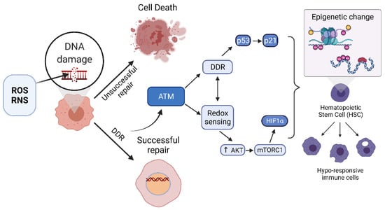 Taken together, recent evidence suggests that components of the DDR, such as ATM and p53, may play critical roles in the cellular antioxidant response to elevated oxidative stress and inflammation through epigenetic regulation of HSCs to impart persistent changes in immune responses.