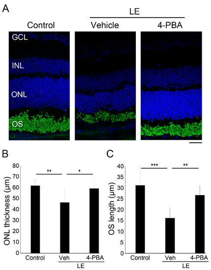 We also evaluated the effect of 4-PBA on retinal histological changes 4 days after LE in the eyes used to obtain the ERG data (Figure 2A–C). The LE-with-vehicle-treatment group exhibited a significantly thinner ONL than the control group. Moreover, the length of rod OSs, where rhodopsin is concentrated, was also reduced in the LE-with-vehicle-treatment group compared with control group. However, these changes were significantly suppressed in the LE-with-4-PBA-treatment group, indicating that 4-PBA protected the retina from photoreceptor degeneration induced by LE.