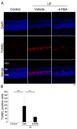 We further analyzed the number of apoptotic cells using a TUNEL assay 2 days after LE (Figure 3A,B), as this is the timepoint where apoptotic cells become significantly increased in the light-exposed retina [12,15,35,38,39,40]. TUNEL-positive and apoptotic cells were increased only in the ONL, i.e., the photoreceptor layer after LE. However, the apoptotic cells were significantly reduced in the LE-with-4-PBA-treatment group, indicating that 4-PBA treatment attenuated light-induced photoreceptor apoptosis.