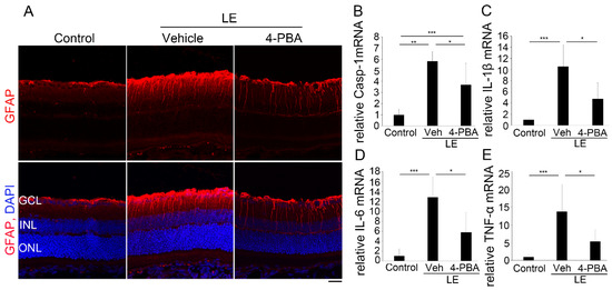 Under normal conditions, GFAP is only present at the end-foot of Müller glial cells, and when they become reactive by stimuli such as light damage [38], GFAP expression is upregulated [43,44,45,46]. We found that GFAP expression was induced 24 h after LE; however, it was decreased in the retina of the LE-with-4-PBA-treatment group (Figure 5A).