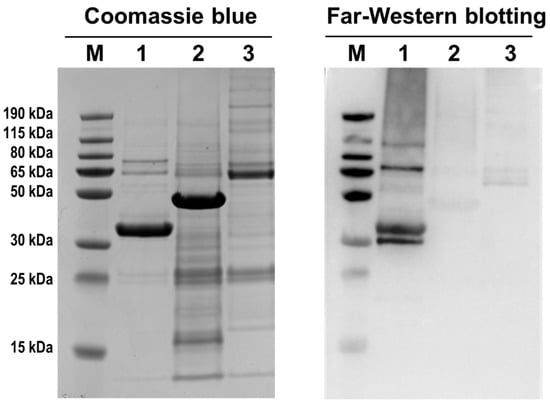 - Wu, Y.; Li, Q.; Chen, X.Z. Detecting protein-protein interactions by Far western blotting. Nat. Protoc. 2007, 2, 3278–3284. [Google Scholar] [CrossRef] [PubMed]