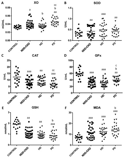 Oxidative stress and lipid damage parameters in plasma from healthy subjects (control), non-dialysis-dependent chronic kidney disease (NDD-CKD), hemodialysis (HD) and peritoneal dialysis (PD) patients. (A) Xanthine oxidase (XO; mU/mL), (B) superoxide dismutase (SOD; U/mL), (C) catalase (CAT; U/mL) and (D) glutathione peroxidase (GPx; U/mL) activities; (E) reduced glutathione (GSH; nmol/mL) and (F) malondialdehyde (MDA; nmol/mL) contents. Data are shown as the mean (horizontal bar) of 17–39 values corresponding to the number of subjects analyzed in each group. Each value is the mean of duplicate assays. a p < 0.05, aa p < 0.01 and aaa p < 0.001 versus control; b p < 0.05 versus NDD-CKD patients; c p < 0.05 and cc p < 0.01 versus HD patients.