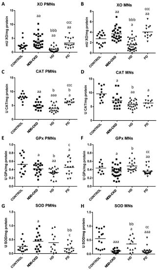 Oxidative stress parameters in isolated peripheral blood polymorphonuclear (PMNs) and mononuclear (MNs) leukocytes from healthy subjects (control), non-dialysis-dependent chronic kidney disease (NDD-CKD), hemodialysis (HD) and peritoneal dialysis (PD) patients. (A) PMNs and (B) MNs xanthine oxidase activity (XO; mU/mg protein); (C) PMNs and (D) MNs catalase activity (CAT; U/mg protein); (E) PMNs and (F) MNs glutathione peroxidase activity (GPx; U/mg protein); (G) PMNs and (H) MNs superoxide dismutase activity (SOD; U/mg protein). Data are shown as the mean (horizontal bar) of 10–32 values corresponding to the number of subjects analyzed in each group. Each value is the mean of duplicate assays. a p < 0.05, aa p < 0.01 and aaa p < 0.001 versus control; b p < 0.05, bb p < 0.01 and bbb p < 0.001 versus NDD-CKD patients; c p < 0.05, cc p < 0.01 and ccc p < 0.001 versus HD patients.