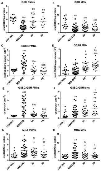 Intracellular glutathione balance and lipid damage in isolated peripheral blood polymorphonuclear (PMNs) and mononuclear (MNs) leukocytes from healthy subjects (control), non-dialysis-dependent chronic kidney disease (NDD-CKD), hemodialysis (HD) and peritoneal dialysis (PD) patients. (A) PMNs and (B) MNs reduced glutathione content (GSH; nmol/mg protein); (C) PMNs and (D) MNs oxidized glutathione content (GSSG; nmol/mg protein); (E) PMNs and (F) MNs GSSG/GSH ratio. (G) PMNs and (H) MNs malondialdehyde content (MDA; nmol/mg protein). Data are shown as the mean (horizontal bar) of 13–39 values corresponding to the number of subjects analyzed in each group. Each value is the mean of duplicate assays. a p < 0.05, aa p < 0.01 and aaa p < 0.001 versus control; b p < 0.05, bb p < 0.01 and bbb p < 0.001 versus NDD-CKD patients; c p < 0.05 versus HD patients.