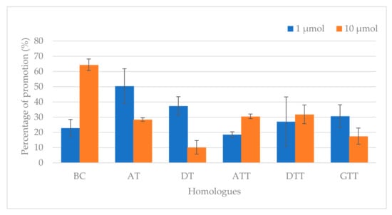 The rate of acrylamide promotion was calculated to predict the impact of individual homologue on the occurrence of acrylamide when subjected to heating (Figure 1). Regardless of homologue levels, a positive rate of acrylamide promotion was observed for all homologues. Moreover, the inclusion of BC into the model system displayed the highest acrylamide content while DT was the lowest. The model system fortified with AT showed the most remarkable rate of acrylamide promotion (50.5%) at 1 µmol; however, acrylamide promotion rate was paramount in BC (64.4%) upon endorsement of homologue level to 10 µmol. The effect of ATT (18.6%) and DT (10.2%) towards acrylamide promotion was the lowest when the homologue levels were set at 1 and 10 µmol, respectively.
