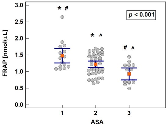 Effect of health condition expressed in terms of ASA score on serum antioxidant capacity measured with FRAP assay in patients with colorectal cancer. Data presented as means with 95% confidence intervals (orange squares with whiskers) and analyzed using one-way ANOVA with Student–Newman–Keuls post-hoc test. Statistically significant differences between groups marked by symbols of the same type (*, #, ^).