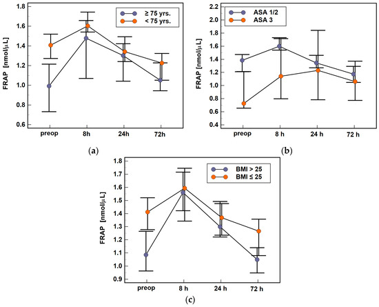 The level of serum antioxidant capacity in colorectal cancer patients during early postoperative period: (a) FRAP and (b) TAC. Data presented as medians with 95% confidence interval and analyzed using Friedman test. Significant (p < 0.05) differences between individual time-points are indicated by symbols of the same type (*, ^, #, +, ∍). Preop, preoperative; 8 h, 8 h post-incision; 24 h, 24 h post-incision; 72 h, 72 h post-incision. Of the modifiers evaluated using two-factor repeated measures ANOVA, the dynamics of FRAP were affected by the patient’s age (Figure 3a), health status (Figure 3b), and body mass index (Figure 3c). Regarding age, higher initial increase was observed in older than younger patients (Δ8h/0: 1.4-fold vs. 1.1-fold, p = 0.015). FRAP increased after 24 h as compared to baseline (Δ24h/0) in ASA3 and not ASA1/2 patients (1.5-fold vs. 1.0, p = 0.008). Regarding BMI, higher initial increase was found in overweight/obese patients than those with BMI < 25 (Δ8h/0: 1.4-fold vs. 1.1-fold, p = 0.018). The detailed results for all analyzed factors with significance of between- and within-subject effects and their interaction are presented in Supplementary Materials, Table S1.