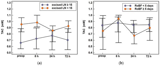 The dynamics of TAC was affected by none of the evaluated modifiers. However, the extent of surgery expressed in terms of the number of excised lymph nodes had a significant impact on TAC preoperatively (0.66 mM vs. 0.96 mM, p = 0.015) and at 8 h (0.73 mM vs. 0.99 mM, p = 0.003) and 72 h post-incision (0.70 mM vs. 0.93 mM, p = 0.009), as patients with higher number of excised lymph nodes had lower TAC levels (Figure 4a). Of the evaluated clinical outcomes, pathological postoperative ileus was associated with significantly lower TAC at 24 h post-incision (0.55 mM vs. 0.76 mM, p = 0.038) (Figure 4b).