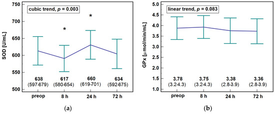 The activity of erythrocyte antioxidants in colorectal cancer patients during the early postoperative period: (a) superoxide anion dismutase (SOD) and (b) glutathione peroxidase (GPx). Data presented as means with 95% confidence interval and analyzed using ANOVA on repeated measures. Significant (p < 0.05) differences between individual time-points are indicated by asterisks (*). Preop, preoperative; 8 h, 8 h post-incision; 24 h, 24 h post-incision; 72 h, 72 h post-incision.