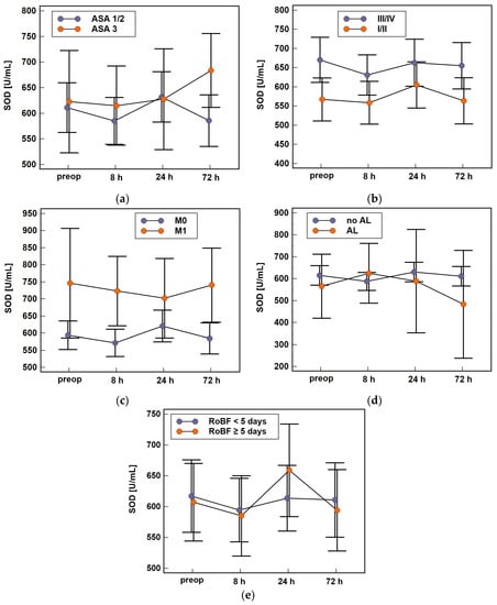 The association of SOD time-course with patient- and disease-related factors and clinical outcomes: (a) the American Society of Anesthesiologists (ASA) physical status classification system; (b) cancer TNM stage; (c) presence of distant metastases (stage M); (d) anastomotic leak (AL); and (e) delayed restoration of bowel function (RoBF). Data analyzed using two-factor repeated measures ANOVA and presented as means with 95% confidence interval. Preop, preoperative; 8 h, 8 h post-incision; 24 h, 24 h post-incision; 72 h, 72 h post-incision.