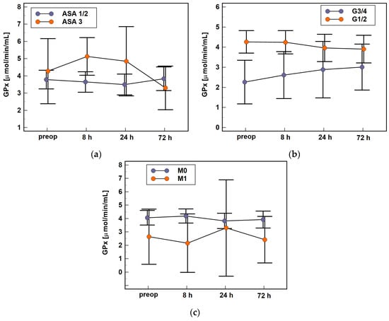 Effect of patient- and disease-related factors on GPx time-course: (a) the American Society of Anesthesiologists (ASA) physical status classification system; (b) tumor histological grade (G); and (c) distant metastases (stage M). Data analyzed using two-factor repeated measures ANOVA and presented as means with 95% confidence interval. Preop, preoperative; 8 h, 8 h post-incision; 24 h, 24 h post-incision; 72 h, 72 h post-incision.