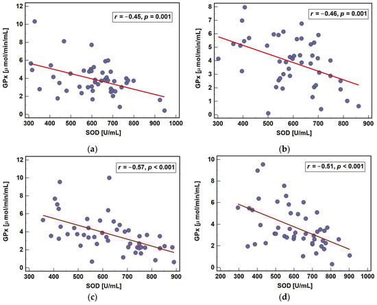 The GPx activity in erythrocytes was negatively correlated with cancer stage (ρ = −0.37, p = 0.005) and histological grade (ρ = −0.48, p < 0.001) and was non-significantly lower in patients with distant metastasis (3.97 μmol/min/mL (3.5–4.44) in M0 vs. 2.64 μmol/min/mL (0.57–4.71) in M1, p = 0.072). It was not associated with patient-related factors and did not correlate with inflammatory mediators.