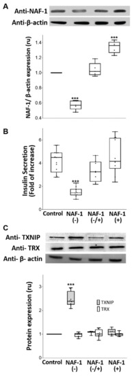 NAF-1 protein levels, insulin secretion, and TXNIP expression in INS-1E cells with repressed or overexpressed NAF-1 levels. (A) Protein blots (Top) and β-actin-normalized expression graph (Bottom) showing NAF-1 protein levels in control, NAF-1(−), NAF-1(−/+), and NAF-1(+) cells. (B) Fold change in glucose-stimulated insulin secretion of INS-1E cells expressing different levels of NAF-1. (C) Protein blots (Top) and β-actin-normalized expression graph (Bottom) showing TXNIP and TRX protein levels in INS-1E cells expressing different levels of NAF-1. The results are presented as box-and-whisker plots and include all data points measured in three different experiments. *** p < 0.001, compared to control; Student’s t-test, N = 3. Abbreviations: TRX, Thioredoxin; TXNIP, Thioredoxin-interacting protein.