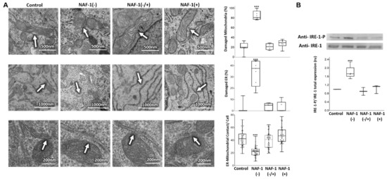 Mitochondrial and ER structural alterations and phosphorylation of IRE-1 in INS-1E cells with repressed or overexpressed NAF-1 levels. (A) Representative TEM images (left panels) and statistical analysis (right graphs) of alterations in mitochondrial (top), ER (middle), and ER-mitochondrial contact points (bottom) structures in control, NAF-1(−), NAF-1(−/+), and NAF-1(+) cells. (B) Protein blots (top) and graph (bottom) showing the ratio between IRE-1 and phosphorylated IRE-1 (IRE-1P) in INS-1E cells expressing different levels of NAF-1. The results are presented as box-and-whisker plots and include all data points measured in three different experiments. *** p < 0.001, compared to control; Student’s t-test, N = 600 for mitochondria and mitochondrial-ER contact and N = 900 for ER. Abbreviations: IRE, serine/threonine-protein kinase/endoribonuclease.
