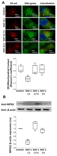 NAF-1(−) cells displayed various abnormalities in mitochondria size, cristae integrity, and ER structure (Figure 2A), possibly as a result of ER stress, as suggested by the increased expression of phosphorylated IRE-1 expression (Figure 2B), an important component of the unfolded protein response (UPR). Moreover, the number of membranal contacts between mitochondria and ER (MAMs) decreased, suggesting fewer interactions between mitochondria and the ER through these structures (Figure 2A and Figure 3A). This reduced tethering was further supported by measuring the levels of mitofusin 2 (MFN2; [43,44,45]), a protein implicated in the maintenance of MAM integrity (Figure 3B). Importantly, mitochondrial, ER, and MAM abnormalities found in NAF-1(−) cells were largely corrected upon re-expression of WT NAF-1 in NAF-1(−) cells (Figure 2 and Figure 3).