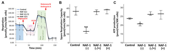 Mitochondrial respiration and ATP production in INS-1E cells with repressed or overexpressed NAF-1 levels. (A) Seahorse-generated plots of mitochondrial respiration obtained for the different lines. Data are presented in normalized values. (B) Spare respiratory capacity calculated from (A). (C) ATP levels calculated from (A). Results in (A) were normalized to the number of cells used (30,000). Data in (B,C) are presented as box-and-whisker plots and include all data points measured in three different experiments. * p < 0.05, *** p < 0.001, compared to control; Student’s t-test, N = 3.